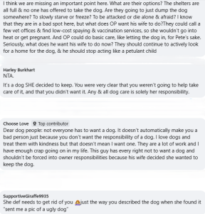 The last incident, the dog was on her period and my wife let her out of the kennel and she jumped on the bed and stained it all with blood. I told her to wash the sheets bcuz that’s disgusting, and she looked mad at me for telling her. She said I was being “cruel” and needed to start helping with her. I said no, that I had never agreed to keeping the dog and it’s 100% her problem.