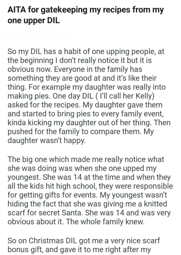 The Original Poster (OP) explains that her daughter-in-law, “Kelly,” has a pathological habit of one-upping everyone in the family. It started with the OP’s daughter, who was the designated pie-maker of the group. Kelly asked for the recipes, and instead of just enjoying them, she started bringing her own versions of those exact pies to every single event. She didn’t just bring them; she pushed the family to compare them, effectively trying to dethrone the original baker. It is a level of social aggression that is usually reserved for reality TV villains, not family potlucks.