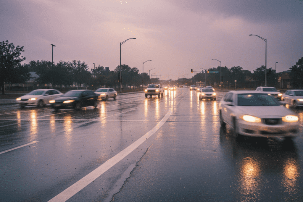 The rain slowed by the time I merged back into traffic, but the wet road still reflected every brake light like a warning.
