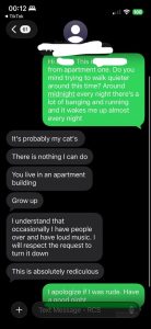 Every night, there are several banging and running tha lasts from midnight to 1 AM. Last night, after a roughy week long migraine, I sent the following text “Hi HIS NAME! This is MY NAME from apartment one. Do you mind trying to walk quieter around this time? Around midnight every night there’s a lot of banging and running and it wakes me up almost every night”. He responded that it is most likely his cats (we aren’t allowed animals), he can’t do anything, and for me to grow up because this is absolutely ridiculous.