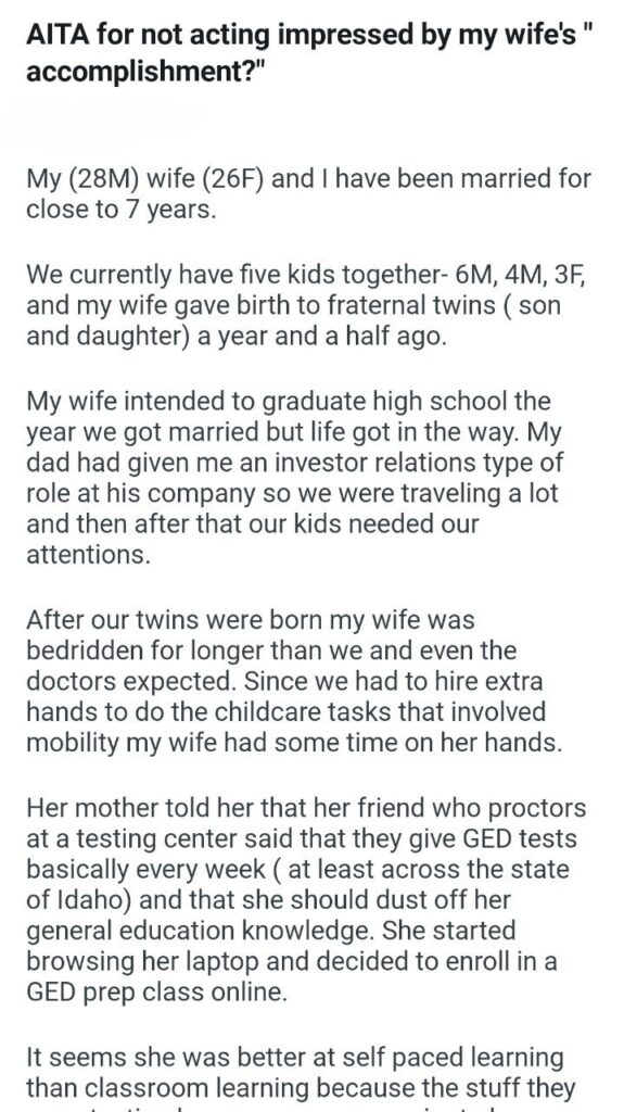 The couple has been married for seven years, and they have been busy to say the least. With children aged six, four, three, and the toddlers, the wife’s goal of graduating high school back in the day got completely sidelined by her husband’s career and the demands of parenthood. After the twins were born, she faced a long recovery that kept her off her feet, which is when she decided to finally tackle her GED. She didn’t just half-heartedly browse the internet; she enrolled in online prep classes and spent her limited free time studying between school drop-offs and childcare duties.