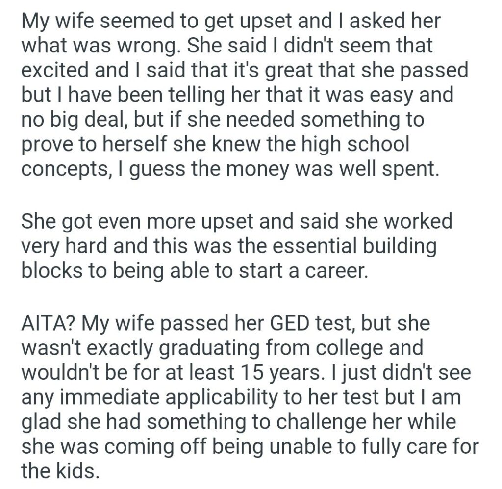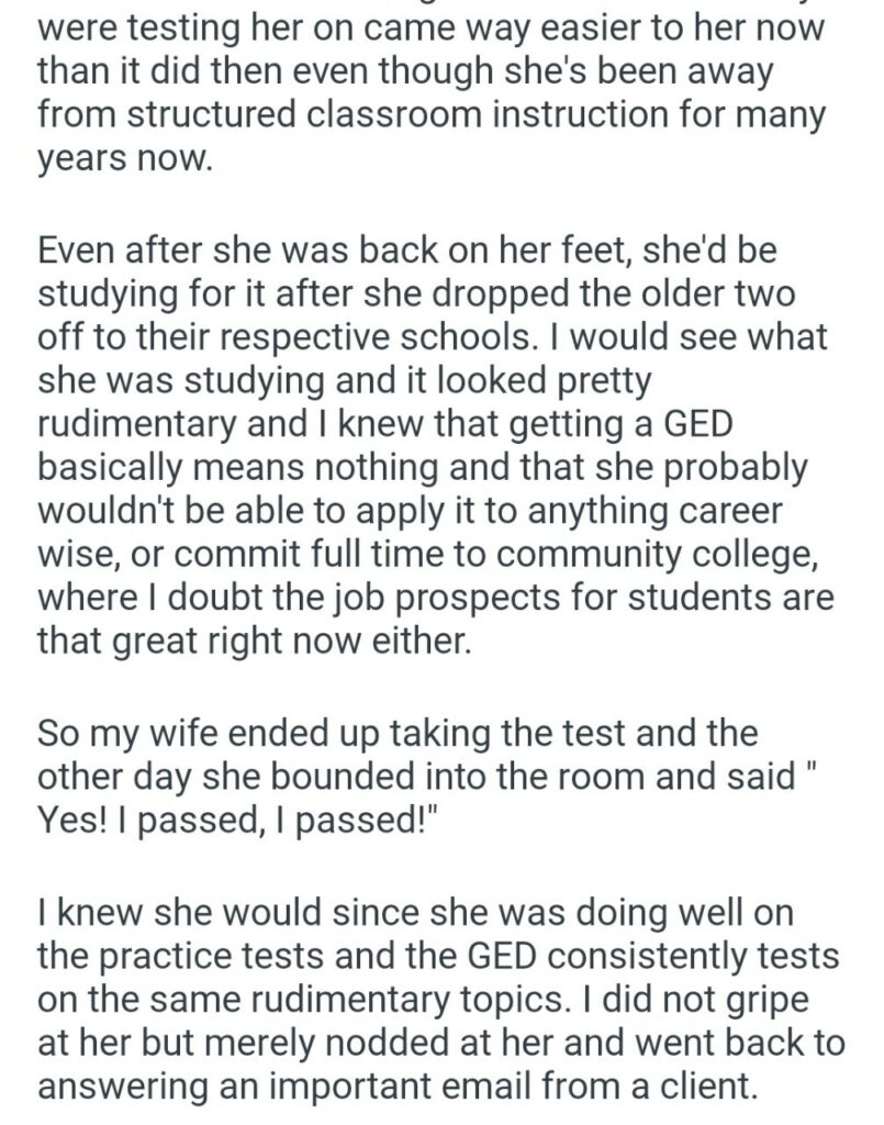 The emotional commentary here is just heavy. The wife is looking at these “building blocks” as a way to eventually start a career and find her identity outside of being a stay-at-home mom. She worked through the haze of raising five kids to accomplish something she missed out on as a teenager. For her husband to call it “easy” just because he didn’t find the math problems challenging is a total ahole move. It ignores the discipline and mental energy it takes to study when you are essentially running a small daycare at home.