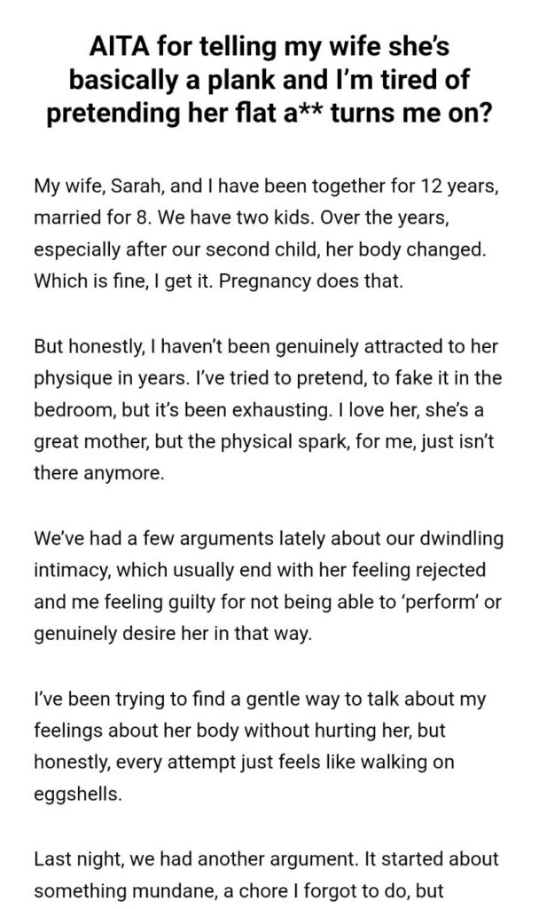 The OP and his wife, Sarah, have been together for over a decade. He admits that after their second child, Sarah’s body changed, which is a story every mother on the planet can relate to. But while Sarah was busy being a “great mother,” her husband was busy faking it in the bedroom. He claims he hasn’t been genuinely attracted to her in years and has spent his life exhausted by the effort of pretending to desire her. Instead of seeking therapy or finding a constructive way to talk about their dwindling intimacy, he decided to let his resentment simmer until it reached a boiling point.