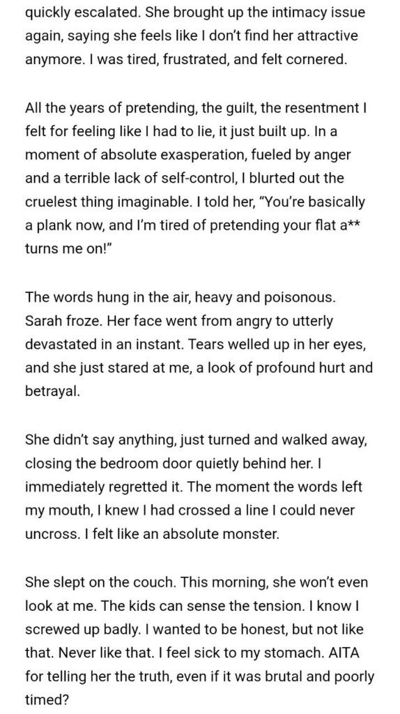 The fallout was immediate and devastating. Sarah didn’t scream or throw things; she simply froze before walking away to sleep on the couch. The OP claims he felt like an “absolute monster” the second the words left his mouth, but the damage was already done. You can’t un-ring a bell that loud. He says he wanted to be “honest,” but there is a massive difference between communicating a lack of spark and tellling the mother of your children that her “flat a**” doesn’t turn you on.