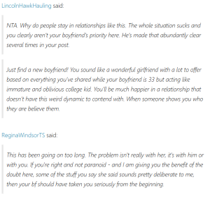 The next morning, he told me I ruined that friendship for him and that I wasn’t empathetic toward her. He also said he couldn’t say anything to her because he “still doesn’t understand what the problem is” and that that conversation would be very unpleasant for him. That made me feel like he had been agreeing with me for months just to keep the peace – without actually taking my feelings seriously.